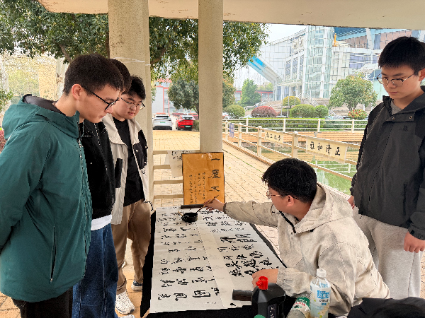 书法协会指导老师鲁云仿现场指导学生,从握笔姿势到章法布局,耐心示范讲解。学院院长冯仲仁也来到现场,驻足观看学生书写,对一幅幅作品点头称赞。冯院长表示,将廉洁教育从课堂延伸到户外,让学生在艺术创作中静心体悟,是一次有益的尝试。