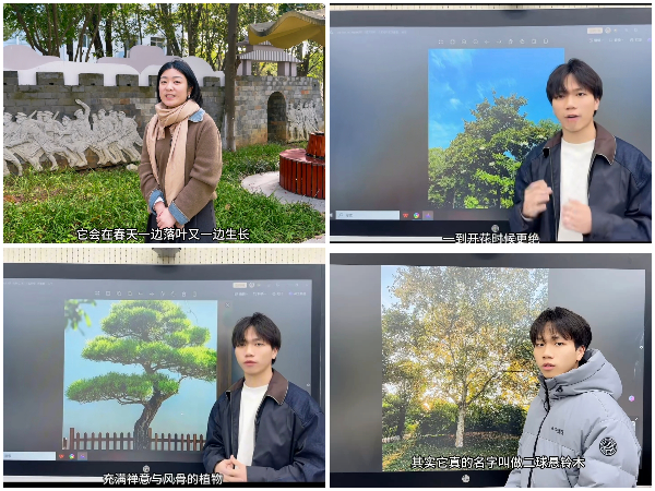 活动伊始,师生共同为花园中的香樟树挂牌。志愿者热情地向老师们介绍树木名牌上的二维码。生物协会学生李喆介绍了同学们精心拍摄制作的树木讲解视频,视频围绕校园内的香樟树、梧桐、罗汉松等树种展开,不仅科普植物知识,更传递了同学们对校园一草一木在不同季节、不同生长阶段的细腻观察与美好期望。李喆表示,从脚本撰写到视频拍摄,同学们投入了大量心血,希望通过这种方式让更多人关注身边的绿色生态。老师们认真观看,对同学们的创意、实践能力及用心给予了充分肯定,并鼓励大家从身边点滴做起,将爱绿护绿理念融入日常。