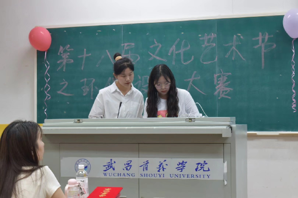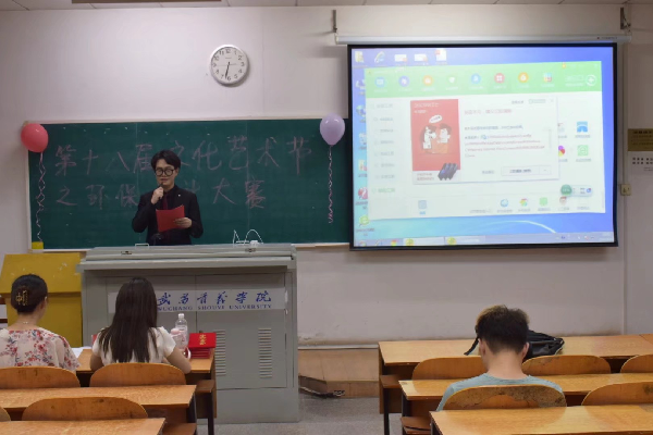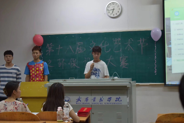 6月17日晚18时30分,城市建设学院承办的第十八届文化艺术节之环保创意大赛决赛在11栋教学楼210教室举行,城市建设学院分团委书记张晶,环境专业杨旗老师,外国语学院辅导员方艺琛出席并担任评委。