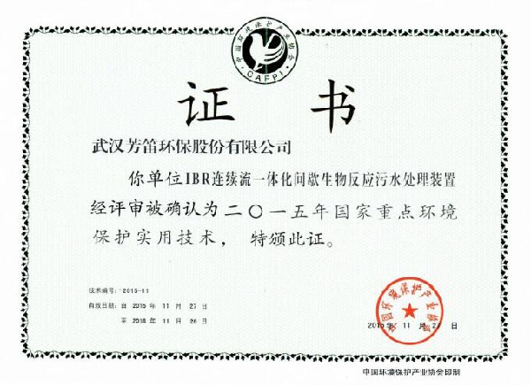 公司拥有多项发明及实用新型专利,均处于国内高端地位。其中“IBR工艺”——连续流一体化间歇生物反应器,是通过大量工程和多年验证的高效、低耗且管理简便的城镇污水处理技术,是国家863重大科技成果,得到了国家和地方政府部门的高度认可并予以推广: