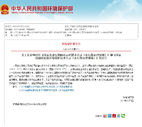 2015年被列入环境保护部《国家鼓励发展的环境保护技术目录(水污染治理领域)》;