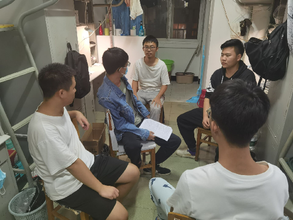辅导员刘栋在20级生物工程专业519学生宿舍,与学生聊学习、谈理想、话成长,并提出四点要求:一是坚定信仰,勇担使命;二是弘扬优良学风,争创先进;三是学会自我教育、自我管理、自我服务、自我监督,营造良好的宿舍文化氛围,创建文明宿舍。引导学生在学习和生活中不断提升、完善、发展自己,发挥主体地位,激发潜能。