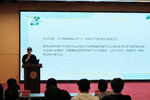 第七届分团委学生会主席吴亚桐总结了上一学年的工作,针对过去一年工作上的不足,对第八届学生会的工作提出了宝贵的建议,学生会工作要加强团队的沟通和协作,更好地履行自我服务、自我管理、自我教育的职能。同时也感谢第七届分团委学生会全体成员上一学年的辛苦付出,
