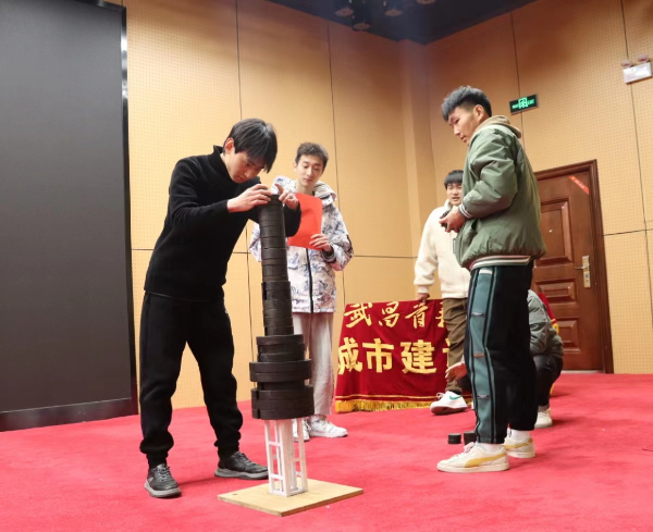 比赛现场,各参赛队伍依次上台展示,并接受承重挑战,“一杯瑞欣”组组长介绍,他们组的灵感来源于我国现存唯一的纯木构楼阁式古塔——应县木塔,前期通过大量的研究和收集资料,以3D建模的方式,克服了失稳效应和扭转效应两大阻碍,以精确的计算设计而成。承重挑战中,每增加一块新的砝码,队长伍子冲动作都是小心翼翼,害怕因为自己的小失误影响到木塔所能承受的最大承重量,“还要继续加吗?”组内的两名成员手拿一块10kg的砝码犹豫不决,队长伍子冲斩钉截铁地说:“继续,加。”“第二十块砝码加重2kg,第二十一块砝码加重2kg……”随着主持人的播报,场上的气氛紧张到凝固,现场鸦雀无声,所有人目光都聚焦正在接受承重测验的木塔。随着砝码重量的不断增加,砝码堆积的高度已经达到成年人胸口的位置,木塔的承重也不断刷新着观众的认识。100kg!现场观众报以热烈的欢呼和雷鸣般的掌声。