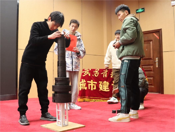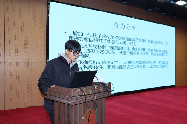 据了解,此次比赛主题为“力建木塔,共营匠心”,经过初赛选拔,最终有9支队伍进入决赛。根据决赛流程,首先由参赛者陈述制作木塔的过程及思路,再进行现场称重演示;评委根据参赛作品的理论方案、作品模型、现场陈述与答辩、加载表现进行综合评分。