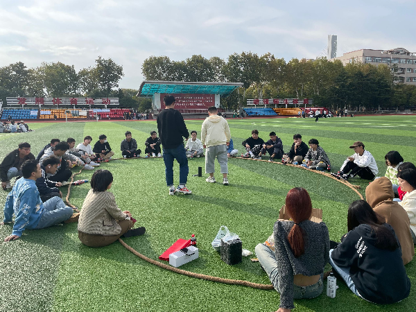 班会结束后,班级成员在操场围坐成圈,主持人黄芯茹介绍本次心理教育活动的基本内容、游戏环节,并邀请部分同学介绍近日在学习和生活中的收获与烦恼。其中,舒馨同学倾诉自己在备考英语四级过程中的压力,以及用日记记录自己情绪的方法。交流完后,同学们分成3支队伍,各自确定了队伍口号、拟定了队伍名称,开始“演员请就位”“兄弟靠得住”游戏大比拼环节。