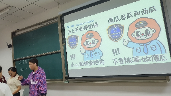 此外,各班开展防诈安全教育。20级辅导员刘栋老师援引真实案例,以案说法,梳理今年以来校园发生的各类电信网络诈骗案例,并详细剖析冒充客服诈骗、虚拟网购及服务类诈骗、冒充熟人或老板类诈骗,期望借此提高同学们识骗、防骗能力。22工造专升本学生冯芊芊给同学们分享了一些电信诈骗的防范和处理措施。她提醒同学们在接到疑似诈骗电话或者短信时要注意核实对方身份,不要轻易汇款。如果来电显示为“0019”等开头的境外号码,不要回复。