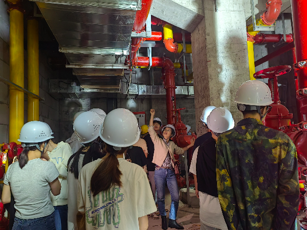 李慎瑰老师以施工现场的室内给排水系统、室内消防系统为典型案例,向同学们详细讲解系统组成、规范条款及设计要点。在地下室生活给水和消防给水设备房,李慎瑰老师又详细讲解了生活水箱和消防低位水池的组成和材质、加压泵的参数。