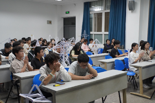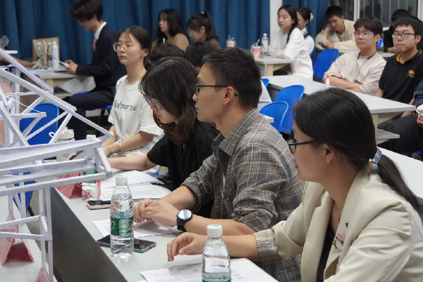 比赛现场,各小组代表依次展示输电塔模型,阐述模型设计的观点。其中,“微笑面对队”介绍了作品设计的灵感来源于伦敦桥塔和跨海大桥。经过大量资料收集,他们选择使用工字形结构,组成核心框架体系。“book思议队”阐述作品的灵感来源主要是“干”字形塔和“上”字形塔,塔型类似于火箭,展示了大学生蓬勃向上的精神。通过学长学姐的指导,她们进行了填缝和贴节点片工作,升级了电塔的传力和强度。刘腾子老师表示对“我们能答队”印象最为深刻,她说:“以学生为主体的科技学术节既是学生研究能力的展示,也是学生之间相互交流学习的平台。每组成员来自不同专业,机电组、经管组学生的输电塔结构在造型上的创新也让我们在比赛中有所收获。”