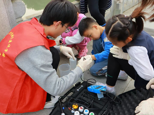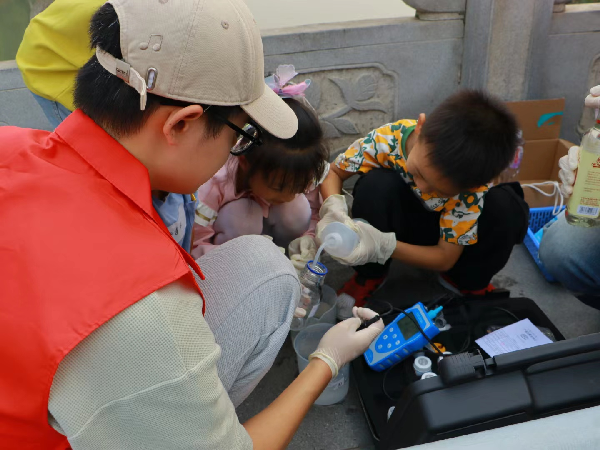 随后,城市建设学院教师王爱琴、郑莹、杨旗和新法学院教师刘洋,联合两院志愿者,带领11名小朋友来到巡司河边,对河水水温、pH值和溶解氧含量进行了检测。