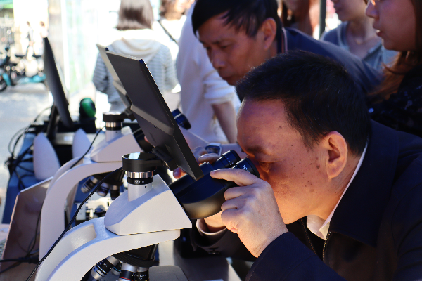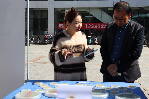 现场设有“湖北省第二届微生物培养皿艺术设计大赛”校内作品评选墙、显微镜样片观察台、培养基实物展示台、实践教学成果及过程展示墙、微生物科普视频等,整个活动现场十分热闹。