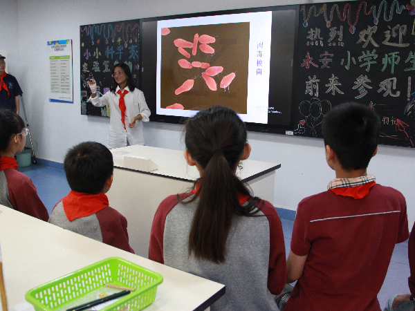 志愿者们带领小朋友们参观了实验室,并为他们详细介绍了微生物实验室,包括实验室的历史、研究方向、研究成果实验,实验仪器及工作原理等,并指导小朋友们分组观察样片。
