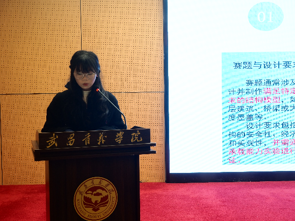 城建学院副院长莫文婷作为竞赛总负责人发言。她首先代表学院向取得优异成绩的师生们表示祝贺。其次,她表示学科竞赛是检验教学质量,提升同学综合素质的有效途径,也是培养同学们创新精神和实践能力的重要平台,并鼓励同学们以获奖师生为榜样,锐意进取,共同为城建学院的发展贡献力量。