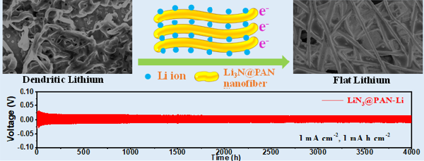 锂金属负极因具有超高的理论比容量和最低的化学势能被誉为锂离子电池体系中负极材料的“圣杯”,然而在实际循环过程中,不可控生长的“锂枝晶”和巨大的体积变化效应阻碍了它的大规模应用。本研究在国家自然科学基金青年基金项目的资助下,开发了一种基于LiN3掺杂的聚丙烯腈(PAN)纳米纤维膜复合锂金属负极材料,可以引导锂离子在循环过程中实现均匀沉积,从而极大地延长了电池的循环寿命。该研究为新型锂金属负极的设计与制备提供了理论基础。