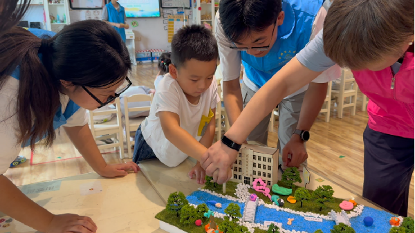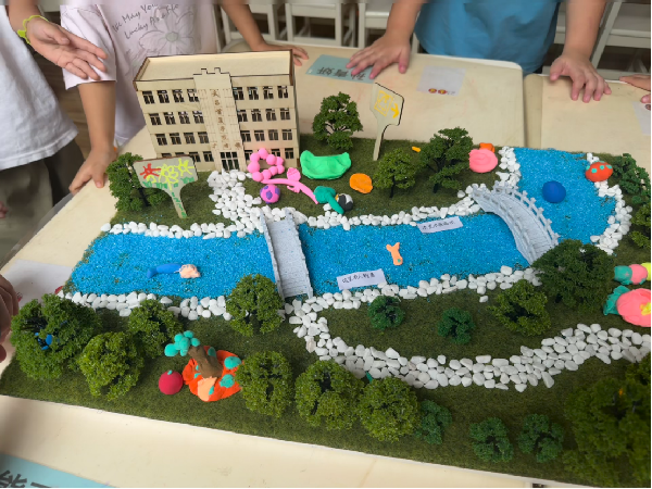 实践环节中,孩子们分组协作,动手完善“巡司河沙盘”:有的用超轻粘土制作树木鱼虫,了解生态构成;有的通过“植树造林”模型思考解决水质问题;还有的亲手检测水样pH值、绘制环保宣传旗,在实验中感知数据背后的环保责任。