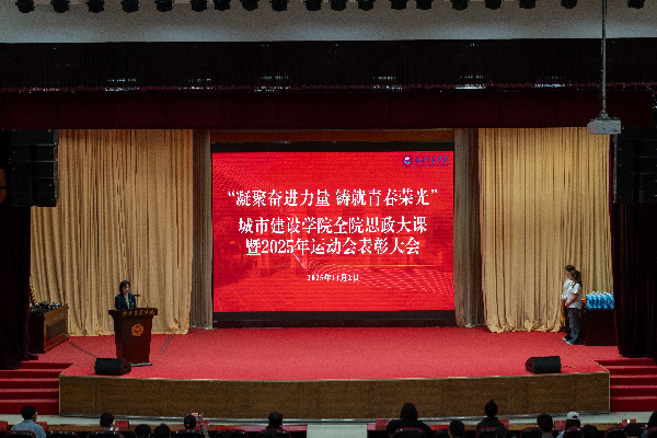 大会还对校运动会中表现优异的学生代表进行了表彰。颁奖结束后,优秀学生代表依次登台分享了自己的心路历程,生动诠释了城建学子风采。其中,男子运动员代表杨胜分享了自己三次代表学院出战校运会的经历,讲述了荣誉背后持之以恒的付出与坚守。女子运动员代表胡丹分享了自己在女子400米项目中勇冠、在200米决赛最后一步意外摔倒与冠军失之交臂的经过,以乐观面对结果、尽情享受比赛过程的态度,向与会师生诠释了“超越胜负”的体育精神,赢得热烈掌声。志愿者代表级张志华用朴实真挚的讲述,回顾了校运会幕后工作的价值与意义,“道具虽然很沉,但方阵同学排练时额头的汗珠,比它的分量要重得多……”他将自己的荣誉归功于志愿者群体的默默付出,深情表示:“因为热爱我们这个集体,所以甘愿为之付出;因为见证了大家的拼搏,所以更想守护这份荣耀。”发言情真意切,令师生动容。方阵代表叶淳回顾了从排练到完美呈现开幕式上《霍元甲》的难忘历程,从初学时的“手忙脚乱”到后期63名同伴默契配合,他表示:“与一群志同道合的伙伴,为一件事共同努力的我们,本身就在闪闪发光。”叶淳的分享生动展现了集体协作所迸发的青春光彩与无限创造力。